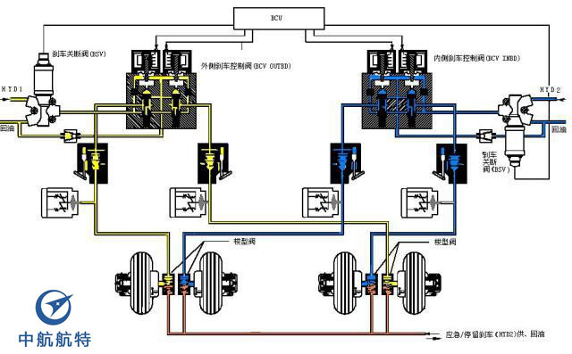 液压系统的基本组成部分包括:能源部分——航空液压油泵、控制部分——控制阀门、执行部分——作动筒与液压马达和辅助装置等。